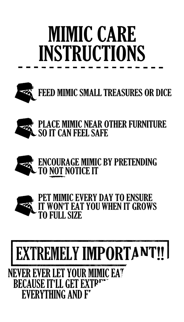Mimics are creatures that pretend to be objects in order to hunt prey or hide in the wild. They can easily blend in with their dungeon environments. The Mimics I care for are the treasure chest species, though they can morph into many other things, like chairs doors and buildings.
